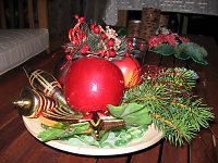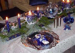 Kerzen gehören auf jeden Weihnachtstisch. Sie sollten schlicht weiß oder rot sein und in hölzernen oder goldenen Kerzenleuchtern stehen. Sind keine vorhanden, können Sie auch biegsame Zweige (Weidenzweige vom Gärtner) rund biegen, mit Draht befestigen und auf die Rückseite eine Bierdeckels kleben. In den Zwischenraum zwischen Kerze und Weidenkranz legen Sie kleine Tannenzapfen oder falls vorhanden Hagebutten (Früchte der Wildrose).