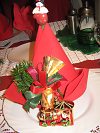 Je nach Farbe des Geschirrs, wobei Weiß immer am Neutralsten ist, sollte mit der Farbe bei den Servietten behutsam umgegangen werden. Es bieten sich einfarbige grüne oder roe Servietten an, die man einfach aufrollt oder zu Bischofsmützen faltet. Dann mit einem grünen oder roten Geschenkband umwickeln. Oben hinein steckt man einen Tannenzweig mit einer kleinen Kugel oder einem anderen Gegenstand aus dem vorhandenen Weihnachtsschmuck. Alternativ könnte man auch einen knackig roten Apfel mit der Serviette umhüllen und mit einen Tannenzweig am Draht fixieren.